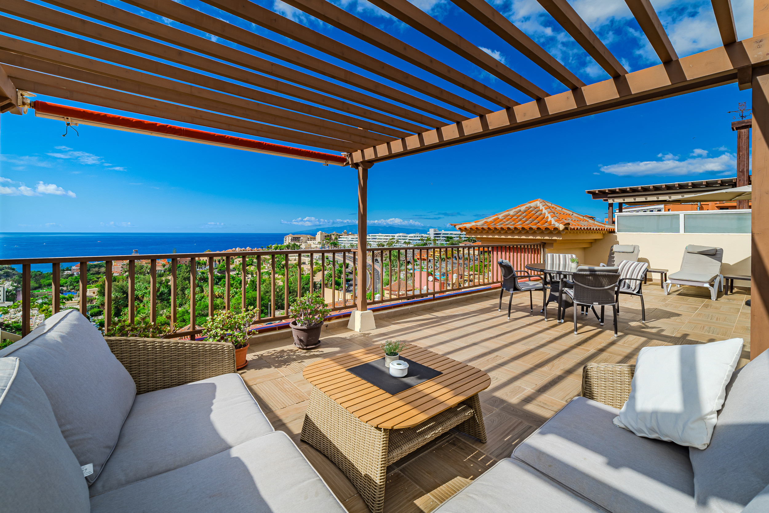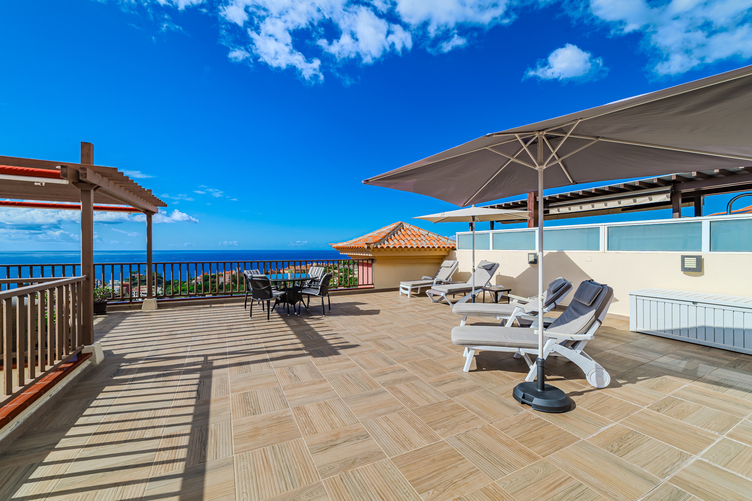 Salga al amplio terraza de 110 metros cuadrados, donde la cena al aire libre y el relax adquieren un nuevo nivel de lujo. Rodeado de exuberante vegetación y con vistas a piscinas comunitarias, este oasis al aire libre invita a los huéspedes a disfrutar del cálido sol de las Islas Canarias mientras se deleitan con las impresionantes vistas de la costa.