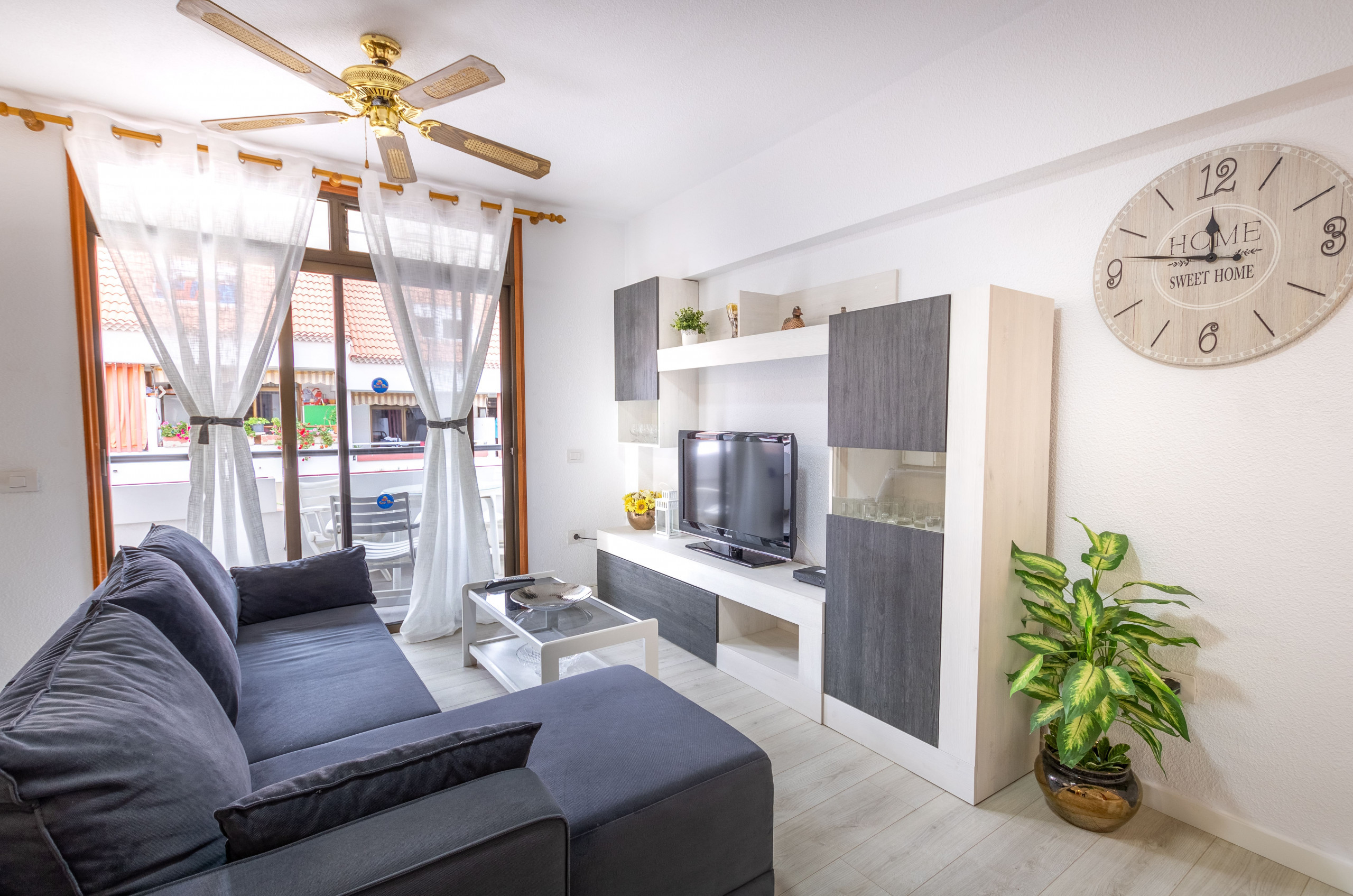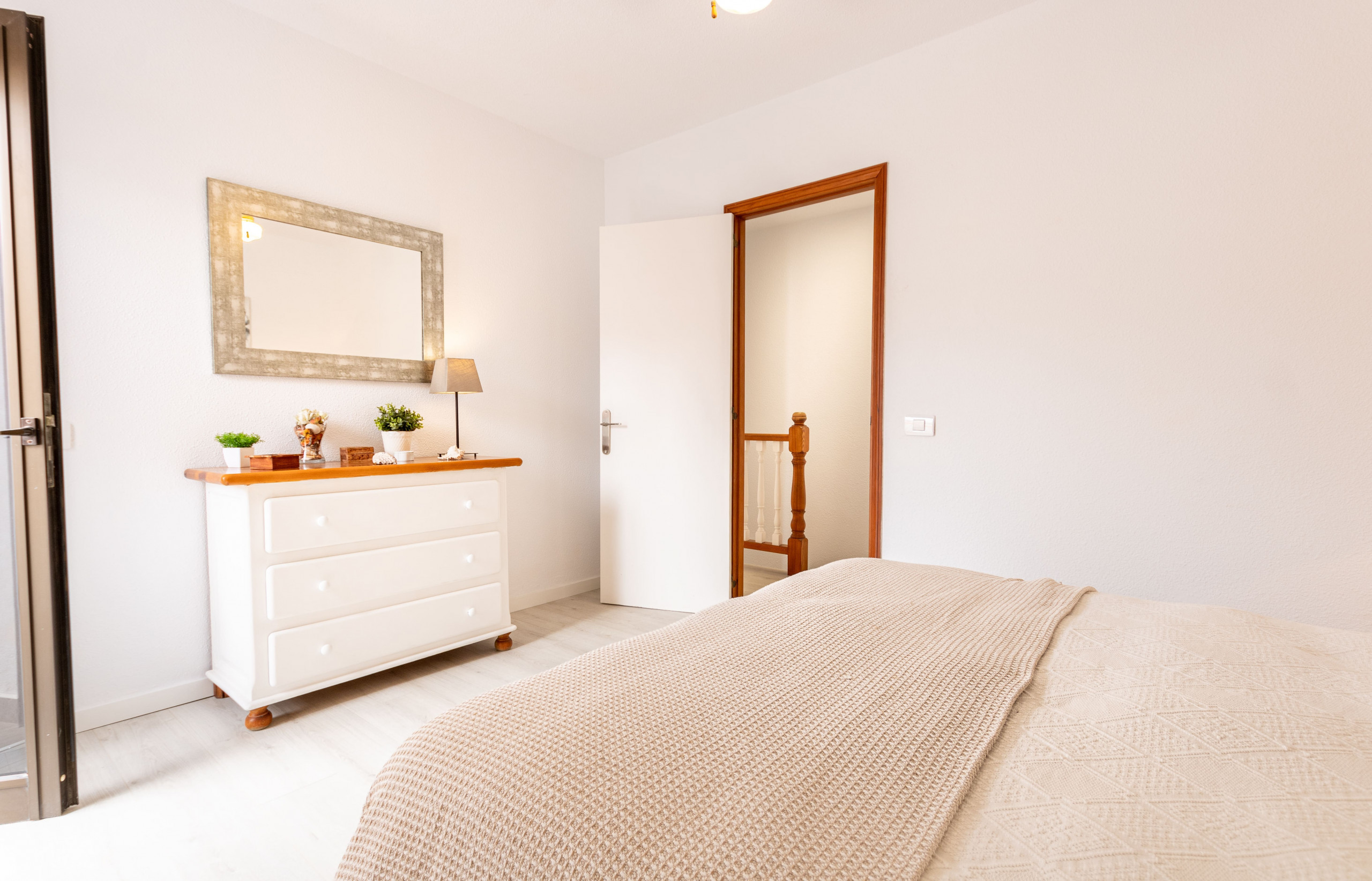 Water in upstairs bathroom was not very warm. We had fairly cold showers most days. No locks on bathroom doors which is an issue if two couples or friends are sharing. The safe in master bedroom has been boarded over. Would be better if this could be brought back into use. Disappointed there were no English TV channels. Overall nice apartment but a little small living/kitchen area. Description should mention it is on the top floor with no lift. We normally holiday with my mother-in-law and she would not have managed the stairs.